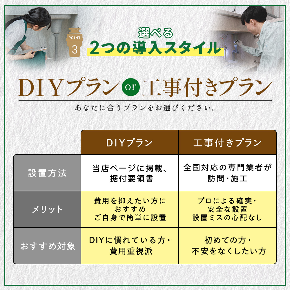 付属品 | 防振型Φ180mmシンク接続アダプター一式、防臭・防虫用掃除口つきエストラップ、専用フレキシブル耐圧排水ホース、40/50mm両用配管接続パーツ、接続バンド、取付要領書、取扱説明書、保証書 |