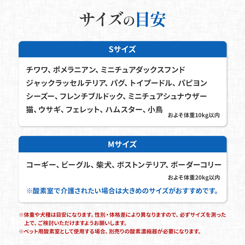 対象ペット | 小型の動物用 犬(チワワ、ポメラニアン、ミニチュアダックスフンド、ジャックラッセルテリア、パグ、トイプードル、パピヨン、シーズー、フレンチブルドッグ、ミニチュアシュナウザー)、猫、ウサギ、フェレット、ハムスター、小鳥 |