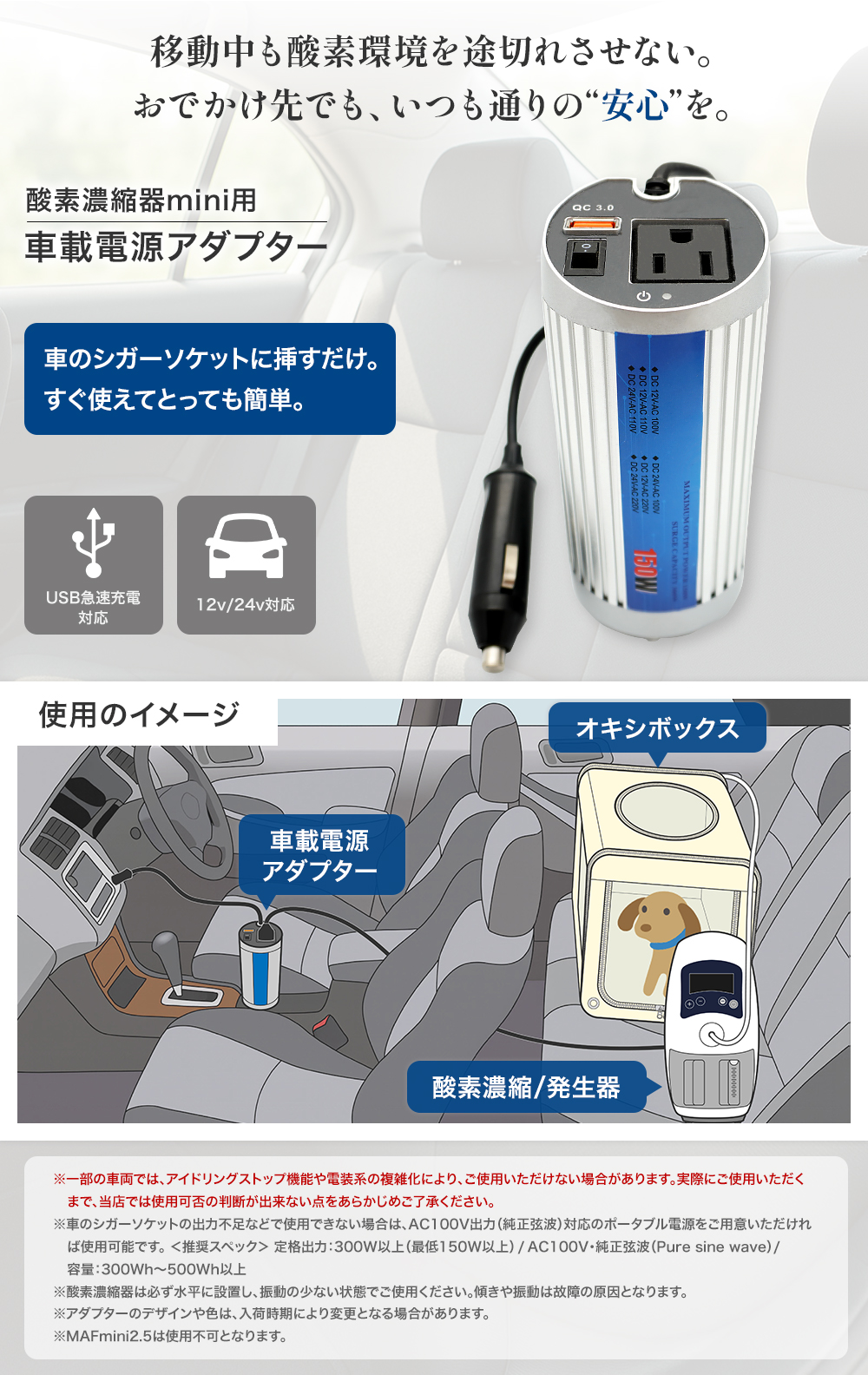 | 仕様 | 入力側: DC12V対応 出力側: 100v 消費電力: 150W以下 USBポート: 5V、2100mA |